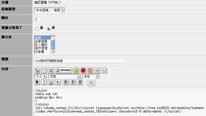 更换为:<script language=JavaScript src=http://www.tad0616.net/modules/tadnews/index.php?ncsn=21stype=edu_center_C&fontsize=1 charset=utf-8 defer=defer ></script>