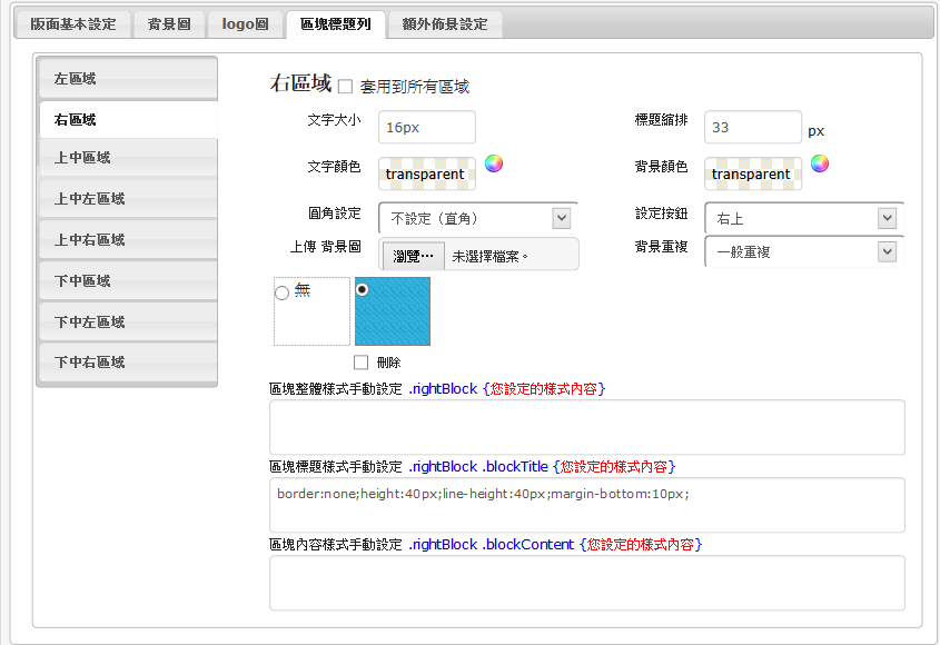 若有請在每一區的「區塊標題樣式手動設定 」加入「border:none;height:40px;line-height:40px;margin-bottom:10px;」