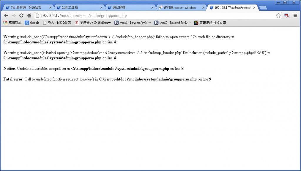 Warning: include_once(D:\my_xoops\www\modules\system\admin../../../include/cp_header.php): failed to open stream: No such file or directory in D:\my_xoops\www\modules\system\admin\groupperm.php on line 4 Warning: include_once(): Failed opening 'D:\my_xoops\www\modules\system\admin../../../include/cp_header.php' for inclusion (include_path='.;D:/my_xoops/home/us_pear/PEAR') in D:\my_xoops\www\modules\system\admin\groupperm.php on line 4 Notice: Undefined variable: xoopsUser in D:\my_xoops\www\modules\system\admin\groupperm.php on line 8 Fatal error: Call to undefined function redirect_header() in D:\my_xoops\www\modules\system\admin\groupperm.php on line 9