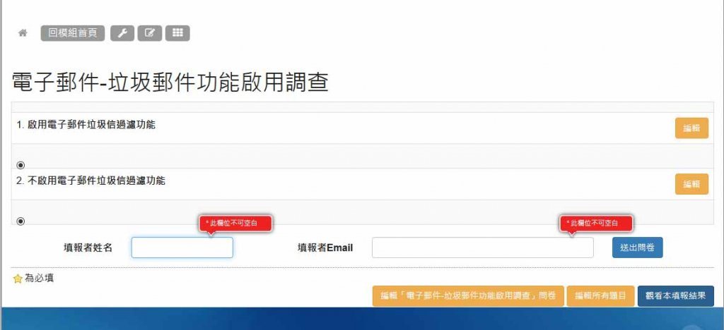 2. 萬用表單,我建立了一個問題,內含兩個答案選項,方法為單選Radio Button,但是使用者在填寫答案時,預設兩個Radio Button都被核取。這兩個答案沒有設定在同一個群組內嗎?