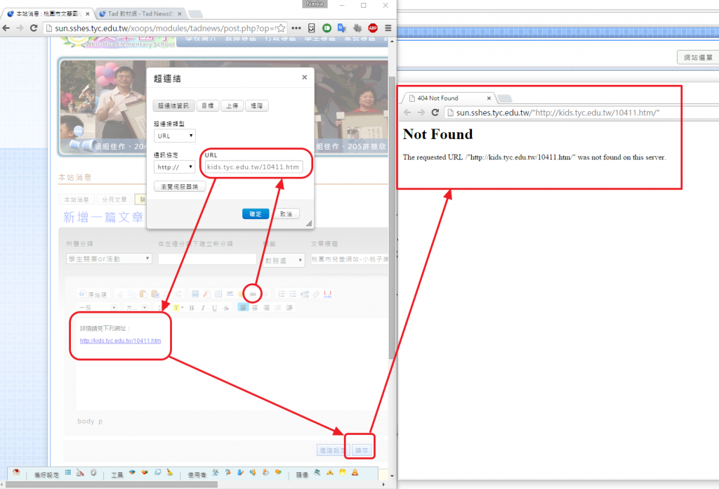 在使用Tad News發布公告時,如果有使用【插入超連結】功能,會導致超連結不正確!