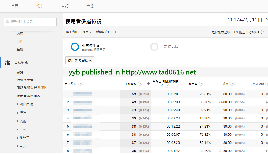 如此一來,隔一天你的GA報表,就可以在新增的資料檢視中的[報表]→[目標對象]→[使用者多層檢視]