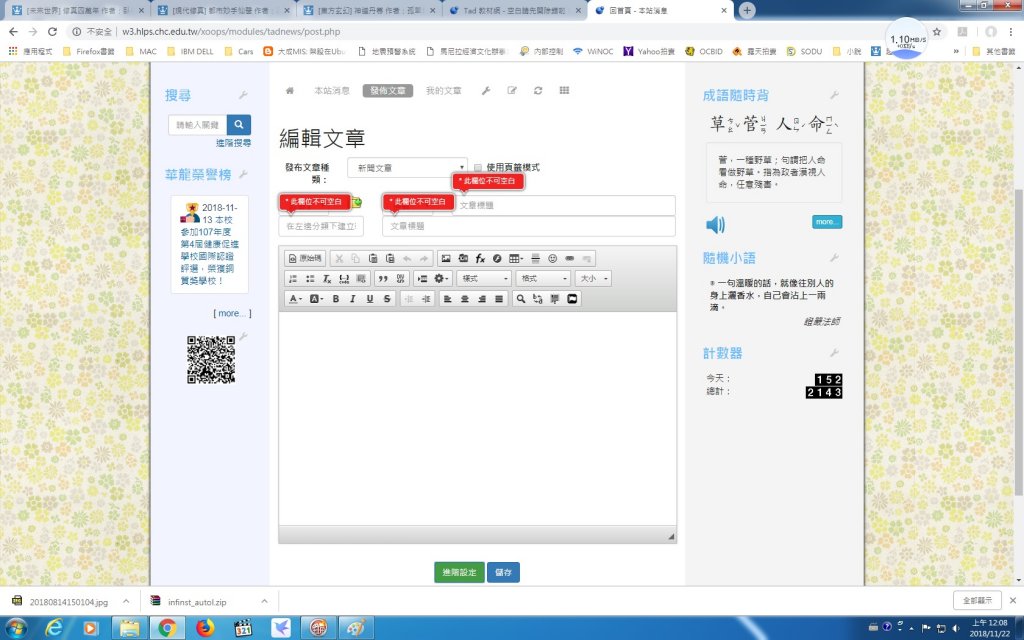 請問當同仁要發布新聞時,除了原本的分類處室群組外,會出現一個空白的群組框,而且標題欄也會有2組,沒填上會要求全部填入才能公告,另外進階設定無法使用(按了無回應),請問可能是哪裡設定錯誤呢? 網址: w3.hlps.chc.edu.tw/xoops