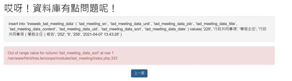 您好,因為本校資安關係將網站進行移機,但發現tad_meeting模組中舊資料均可讀取,點選新增會議報告後填寫完文字並存檔時出現訊息如附件。 看起來好像是加入會議報告時資料被加到了第一排上,但第一排原本就有資料所以導致溢出。但我不知道在php中修正...在請各位協助了,感激