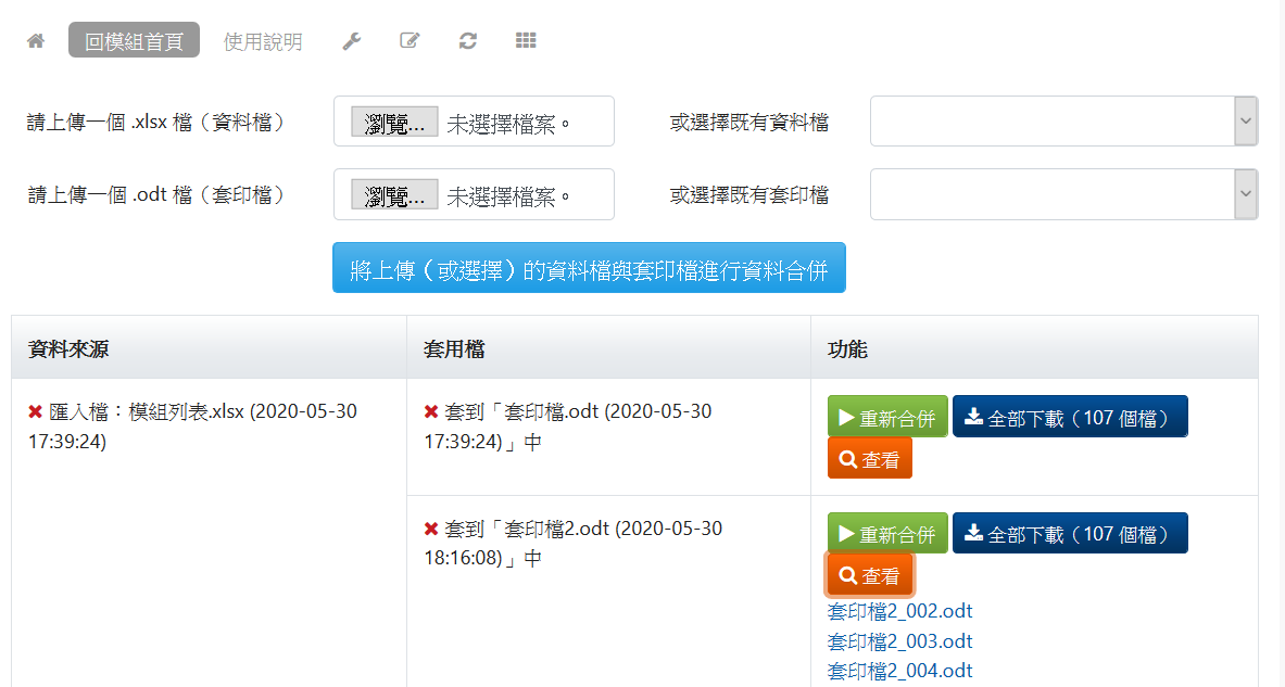 其實就是線上版的合併列印。只要提供資料來源(.xlsx檔),以及要列印的文件檔(.odt檔),上傳後就可以進行資料與檔案合併,適合拿來套印獎狀、證書...有的沒有的東西。