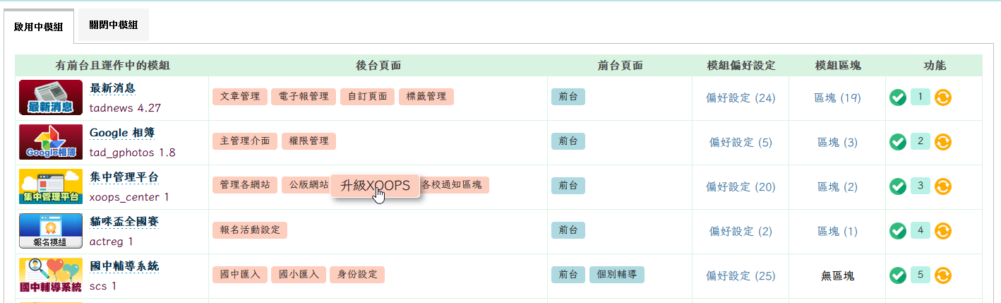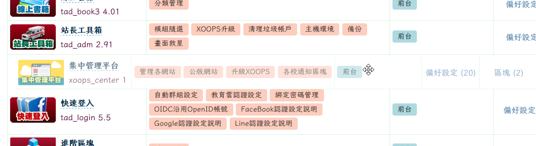 - 可以直接點擊後台或前台頁面,還會列出有多少區塊或偏好設定,亦可直接開關模組或更新組