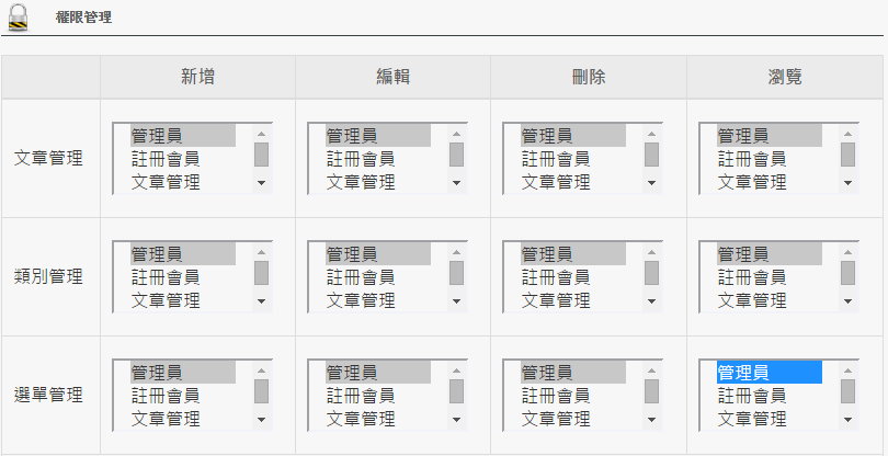- 每個權限項目各自有「新增」、「編輯」、「刪除」、「瀏覽」
