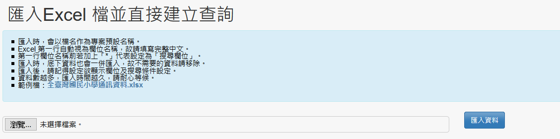 3.後台亦提供直接匯入Excel以建立查詢資料,可自動在第一行欄位名稱設定「搜尋欄位」。
